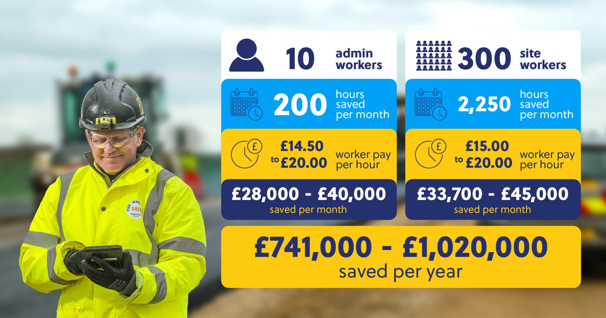 £1,000,000 saved per year across a team of 10 admin workers and 300 site workers. 136% improvement in on-site audits. 100% compliance rates…
