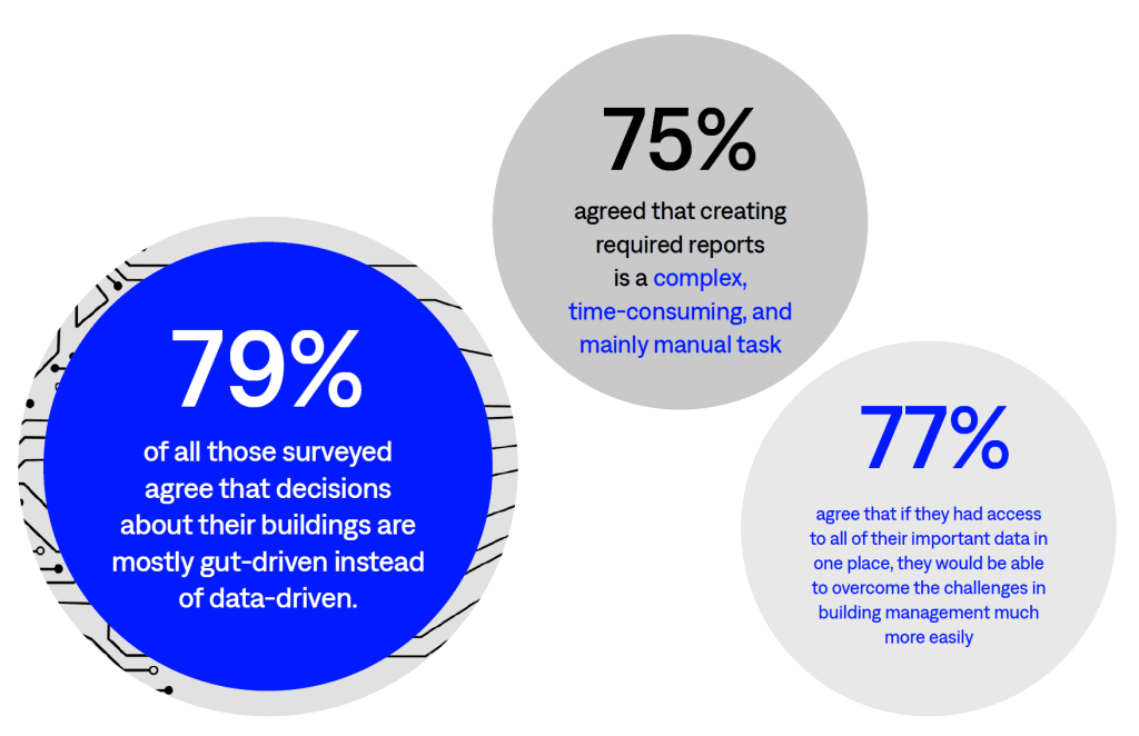 Additional responses from the survey further support the notion of a data gap. For example, 77% of respondents said they constantly needed insight into the real-time performance of their buildings and 79% say there needs to be a single repository for all important building data.